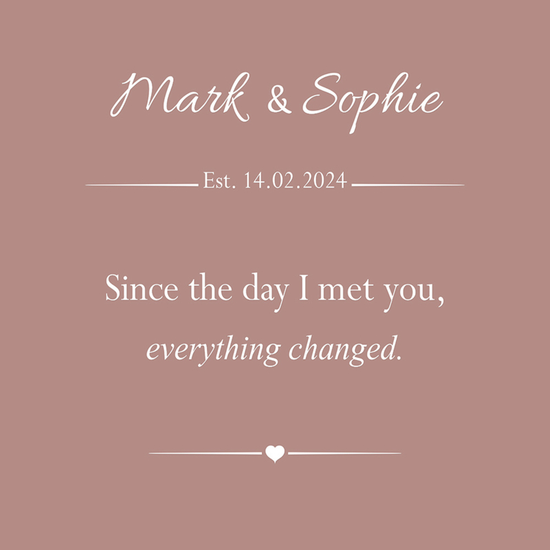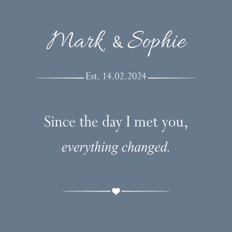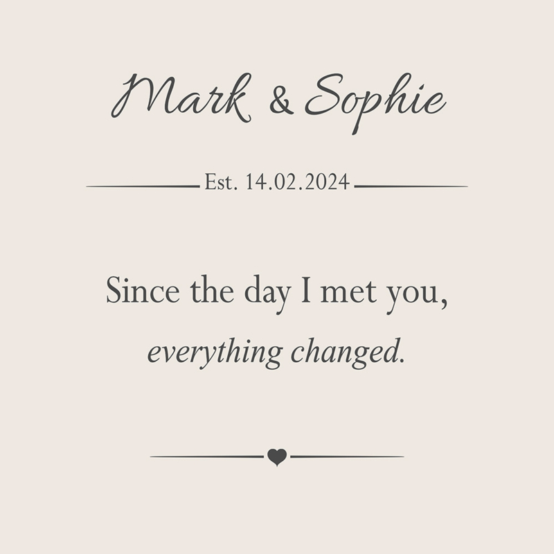 Maak dit canvas helemaal eigen door een foto toe te voegen. Zo creëer je een uniek en persoonlijk cadeau dat perfect past bij een bijzondere gelegenheid. Ontwerp jouw eigen tekst op canvas en laat jullie liefdesverhaal vereeuwigen.