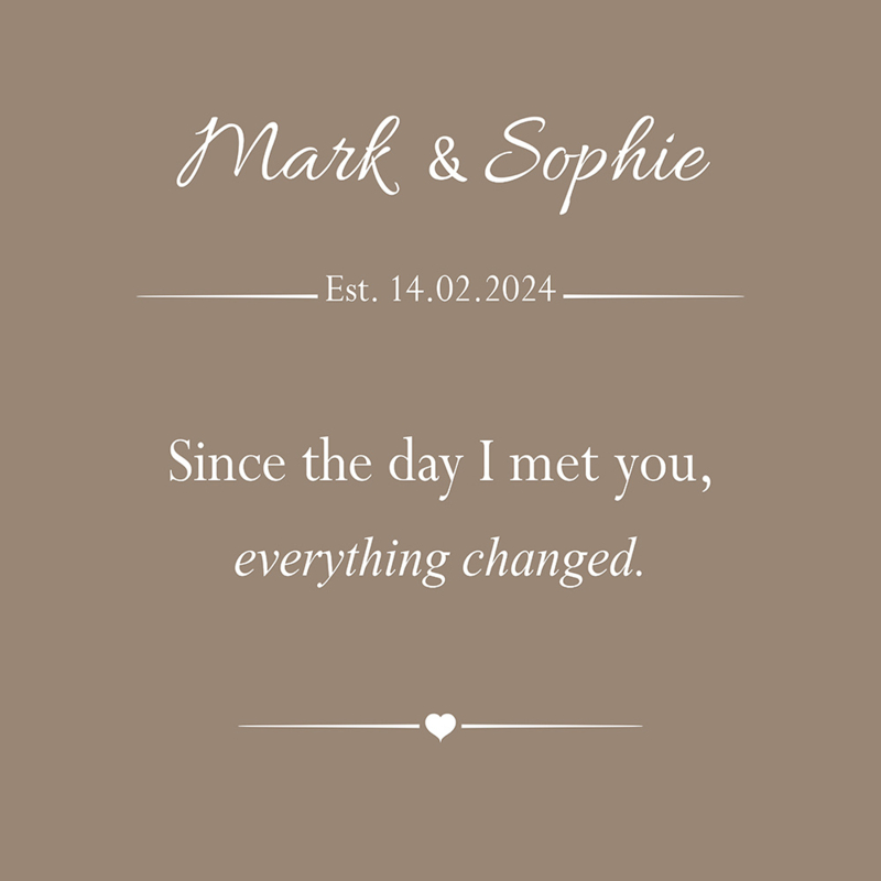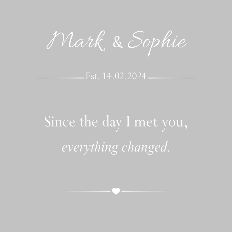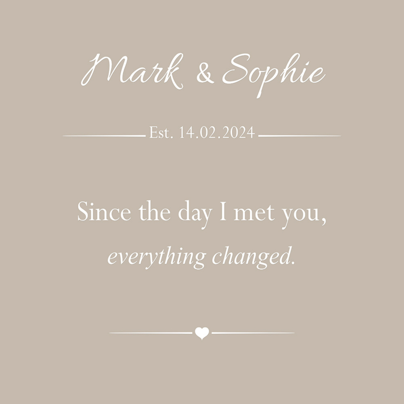 Geef je interieur een warme en betekenisvolle uitstraling met deze tekst op canvas. De quote “Since the day I met you, everything changed” verwoordt op een eenvoudige en krachtige manier wat liefde kan doen. Een tijdloze boodschap die herinnert aan dat ene bijzondere moment waarop alles anders werd. Perfect als romantische wanddecoratie voor de slaapkamer, woonkamer of een intieme plek in huis.