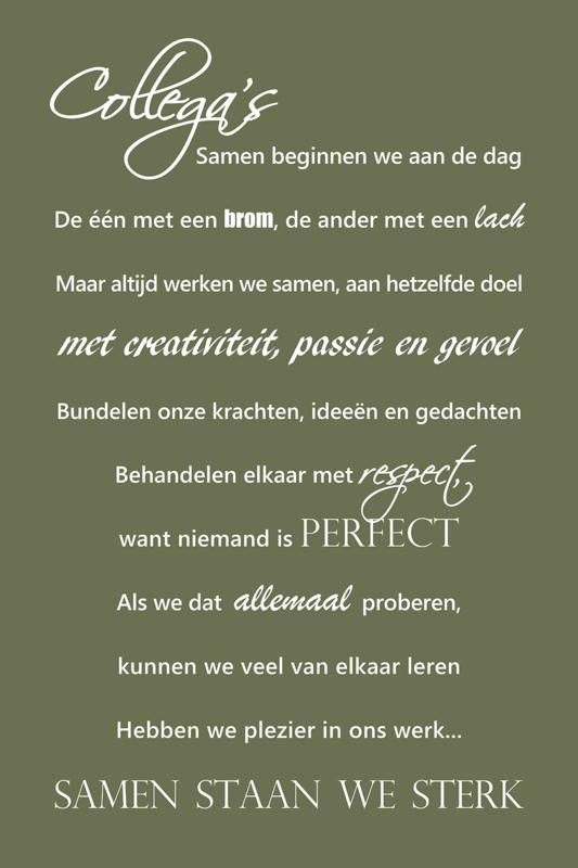 Met een eigen tekst op canvas maken we een olijfgroen ontwerp volledig op maat.