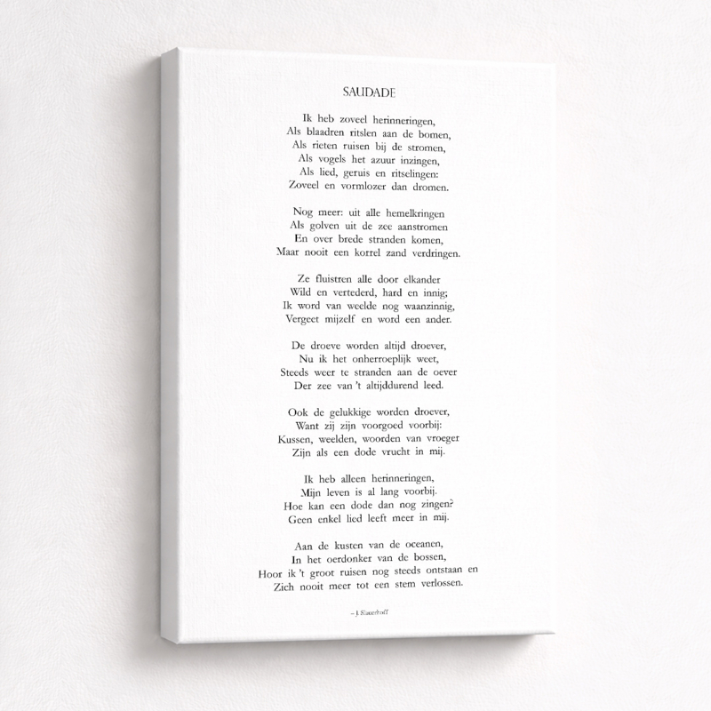 Onze ontwerpen worden gedrukt op hoogwaardig canvas met heldere, duurzame kleuren, zodat de herinnering niet vervaagt, hoe de tijd ook verdergaat.